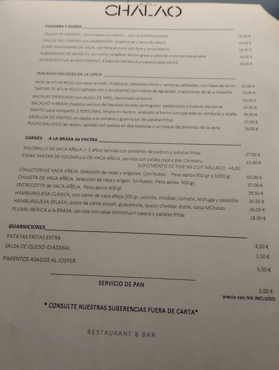 Guests can expect a mix of traditional and modern touches, with options like Chuletón and Pulpo con Papa Canaria alongside lighter fare such as Tempura de Verduras or Tartar de Atún. The menu also offers crowd-pleasers like Hamburguesa Splash and Nachos Chalao that pair well with refreshing local beers and thoughtfully chosen drinks.